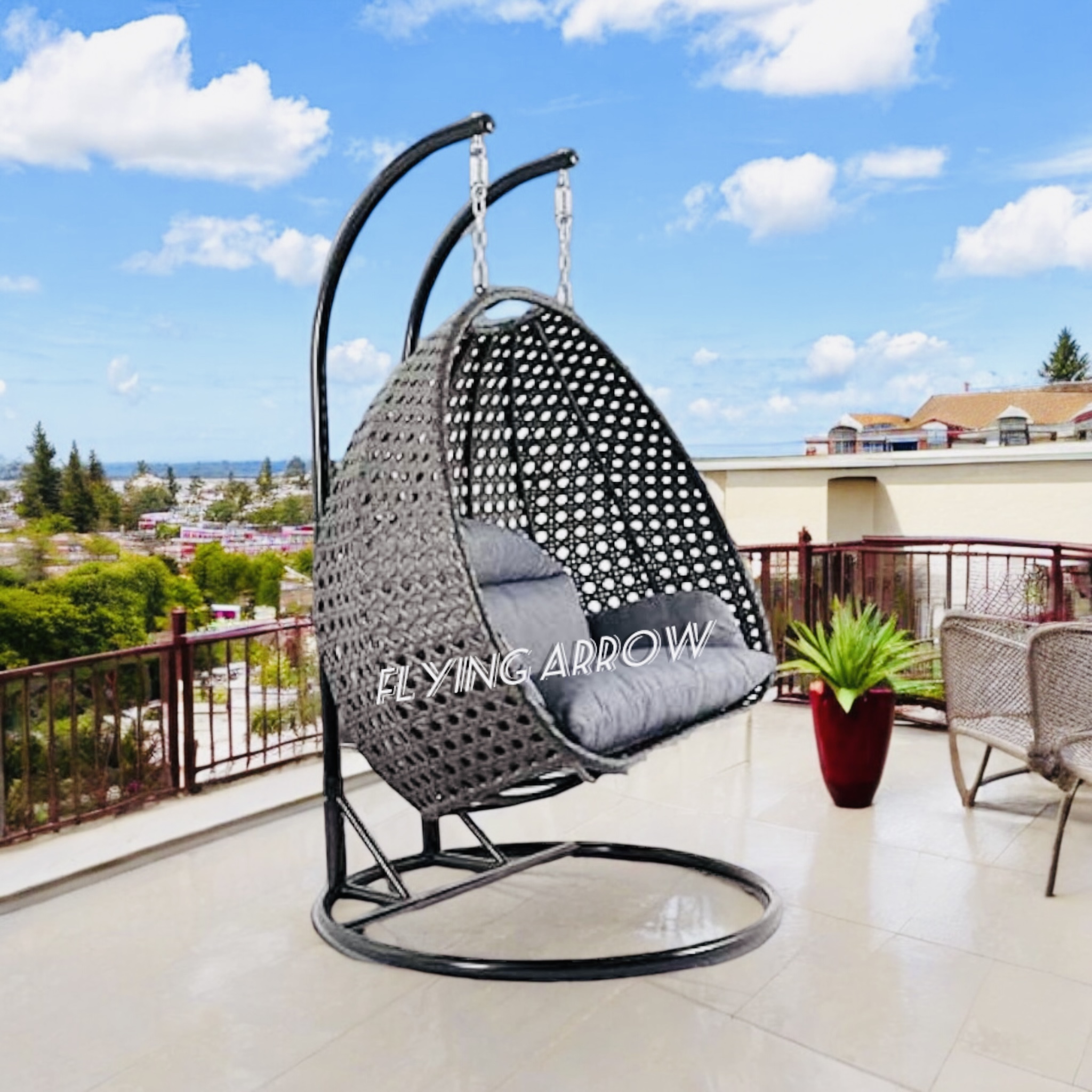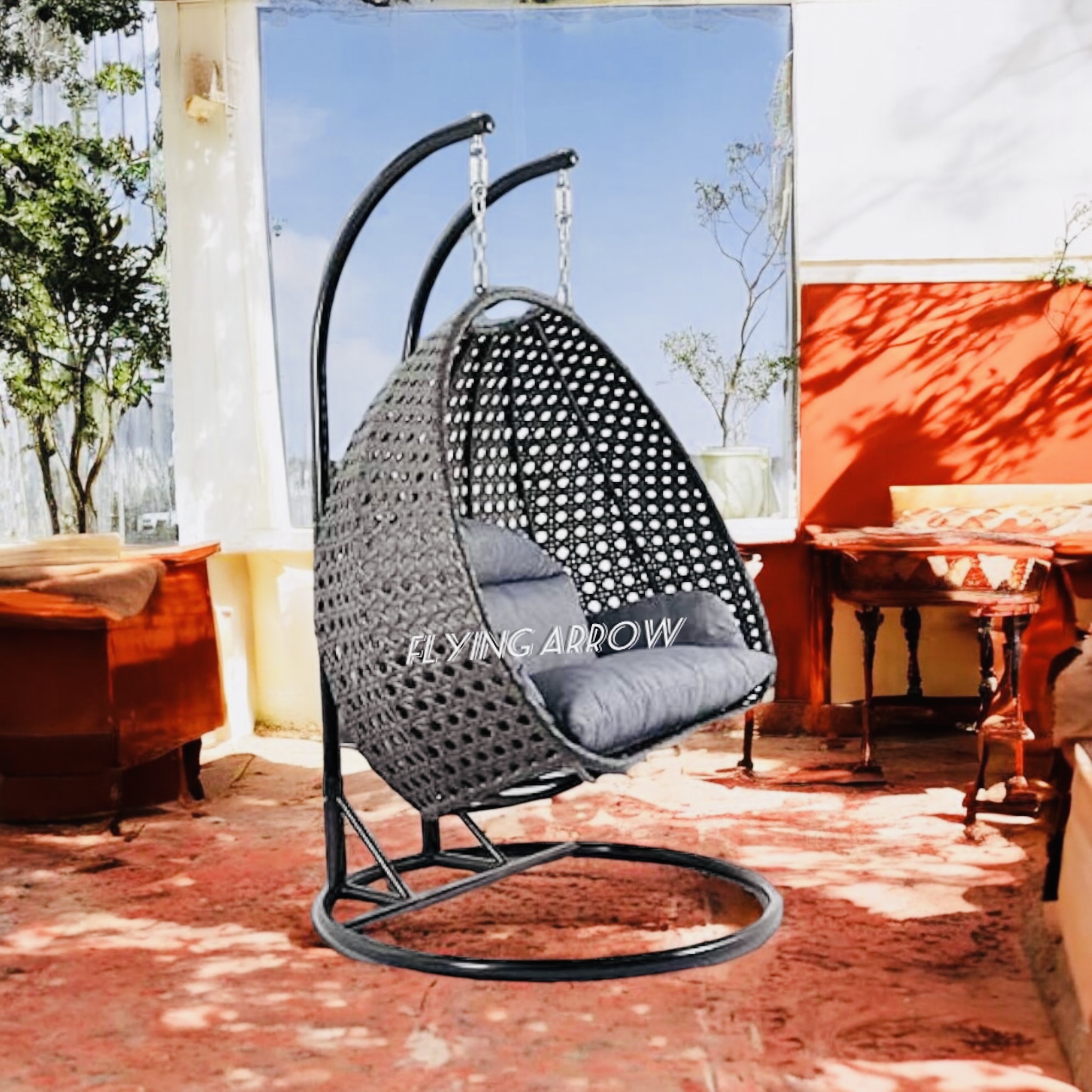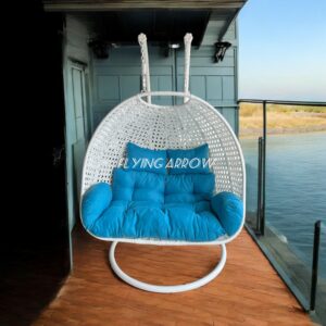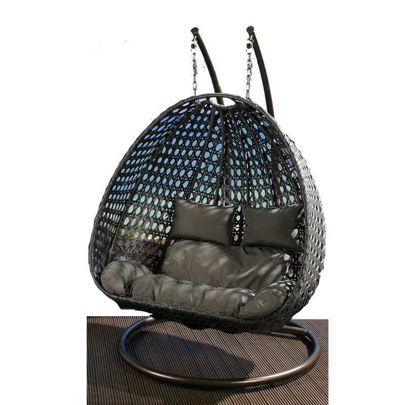 • HANDWOVEN AND HANDCRAFTED IRON AND WICKER 2 SEATER SWING CHAIR: Add a playful look to your patio with this outdoor hanging hammock swing stand chair for adults. Deck up your balcony with this all-weather synthetic PE wicker with a heavy duty powder-coated iron frame. The antique bronze finish swing can hold up to 180-200 KGS in weight capacity. This beautiful hanging basket swing comes with a chain. Enjoy the garden, Outdoor, or indoor with this easy to manage patio decor in any weather