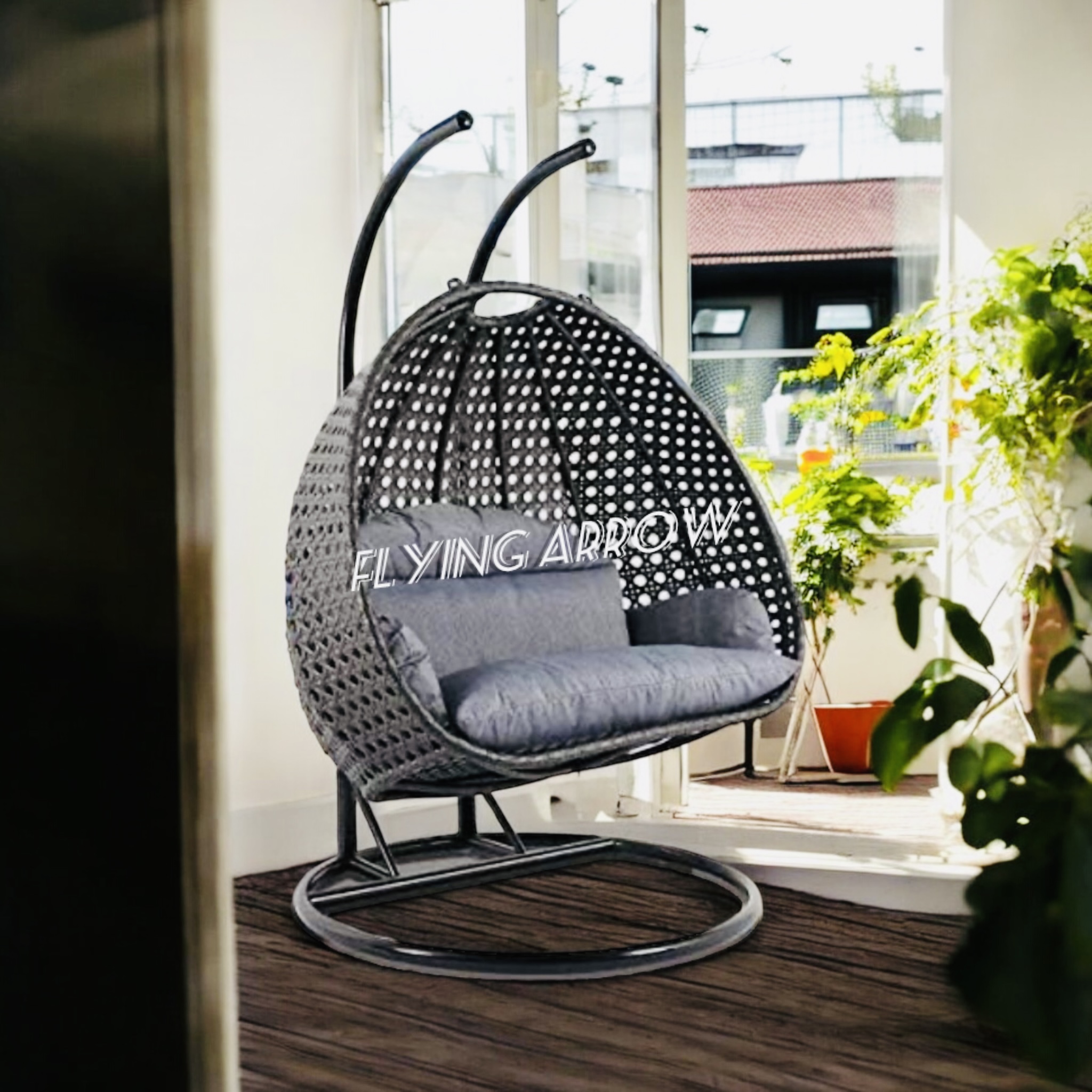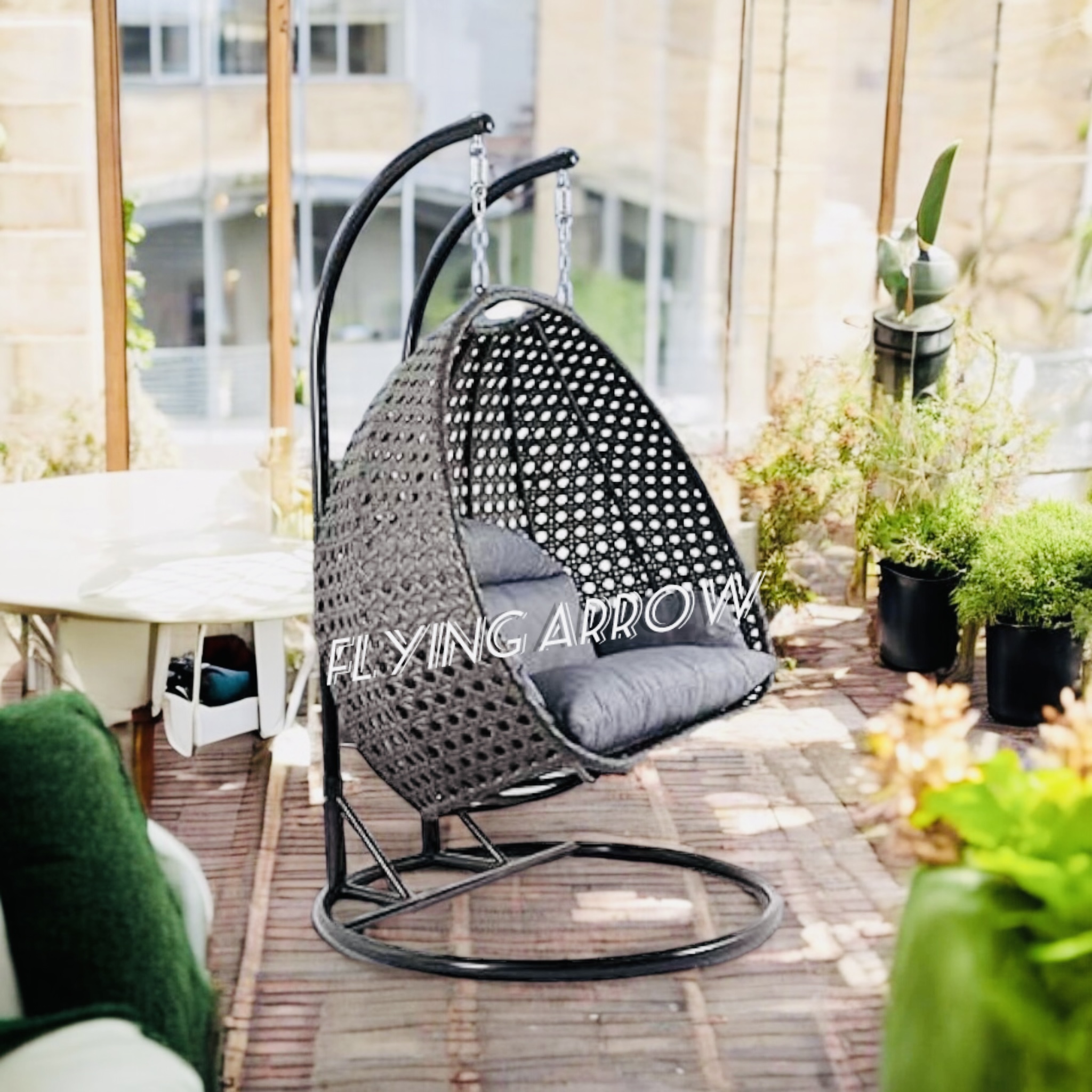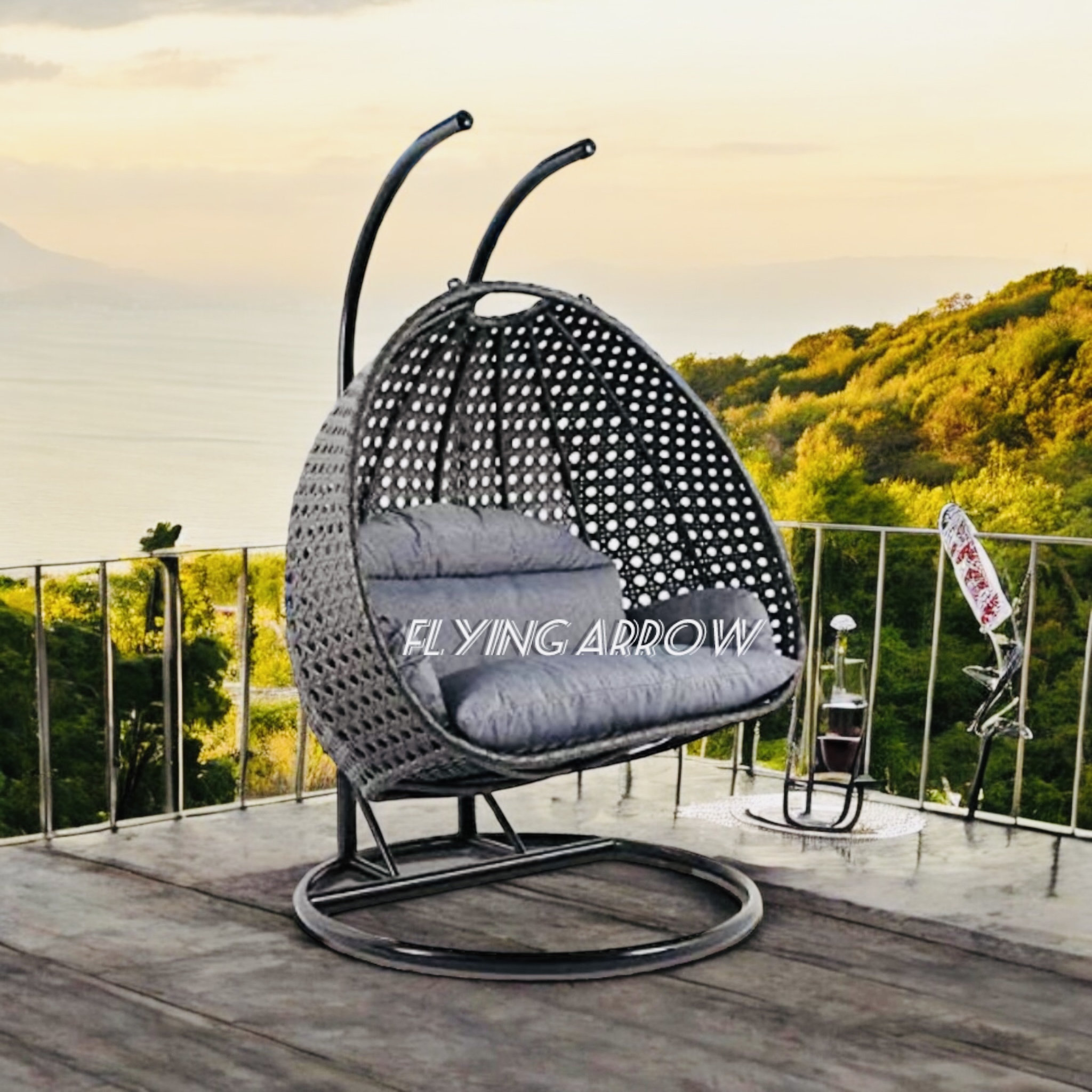 • HANDWOVEN AND HANDCRAFTED IRON AND WICKER 2 SEATER SWING CHAIR: Add a playful look to your patio with this outdoor hanging hammock swing stand chair for adults. Deck up your balcony with this all-weather synthetic PE wicker with a heavy duty powder-coated iron frame. The antique bronze finish swing can hold up to 180-200 KGS in weight capacity. This beautiful hanging basket swing comes with a chain. Enjoy the garden, Outdoor, or indoor with this easy to manage patio decor in any weather