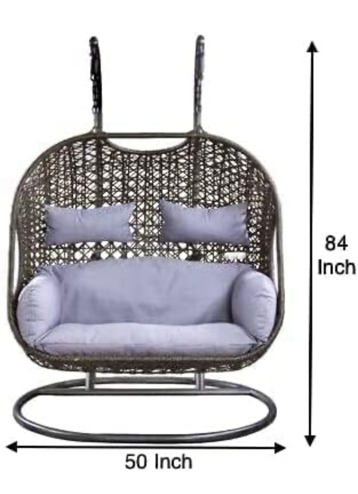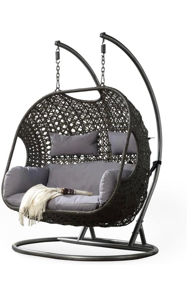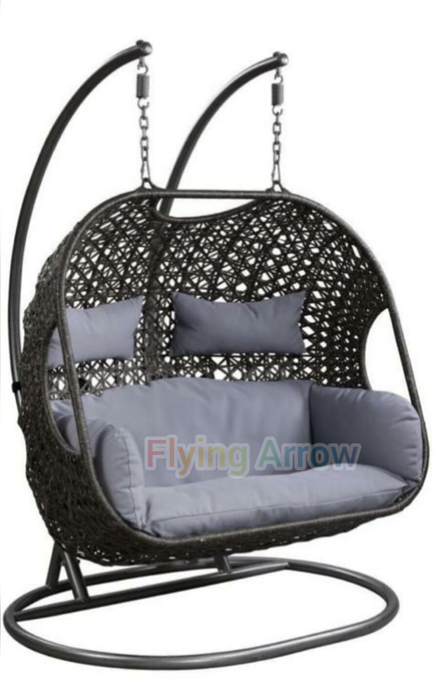 BLACK DOUBLE SEATER HANGING SWING WITH STAND FOR BALCONY , GARDEN SWING WITH GREY CUSHIONS