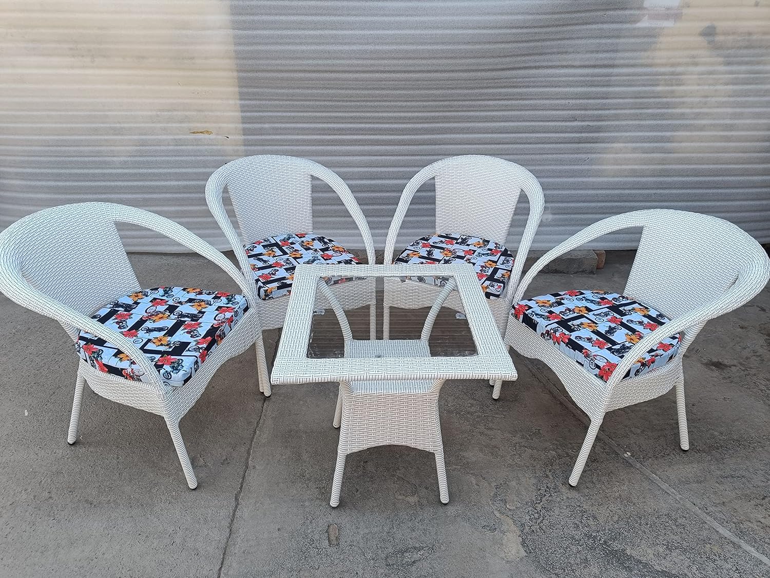 WHITE CHAIR SET WITH PRINTED CUSHIONS AND GLASS TABLE WITH BEAUTIFUL OUTDOOR FURNITURE