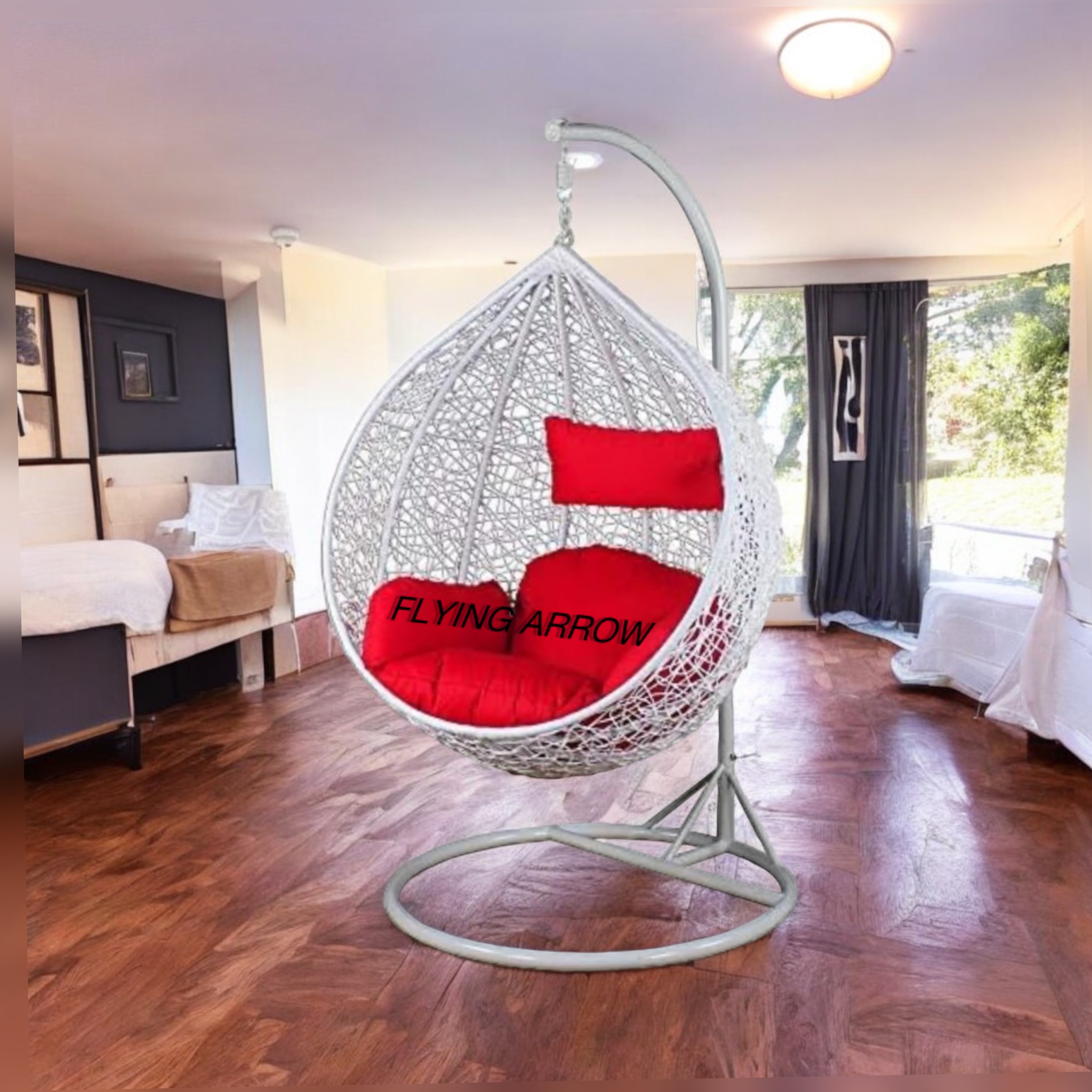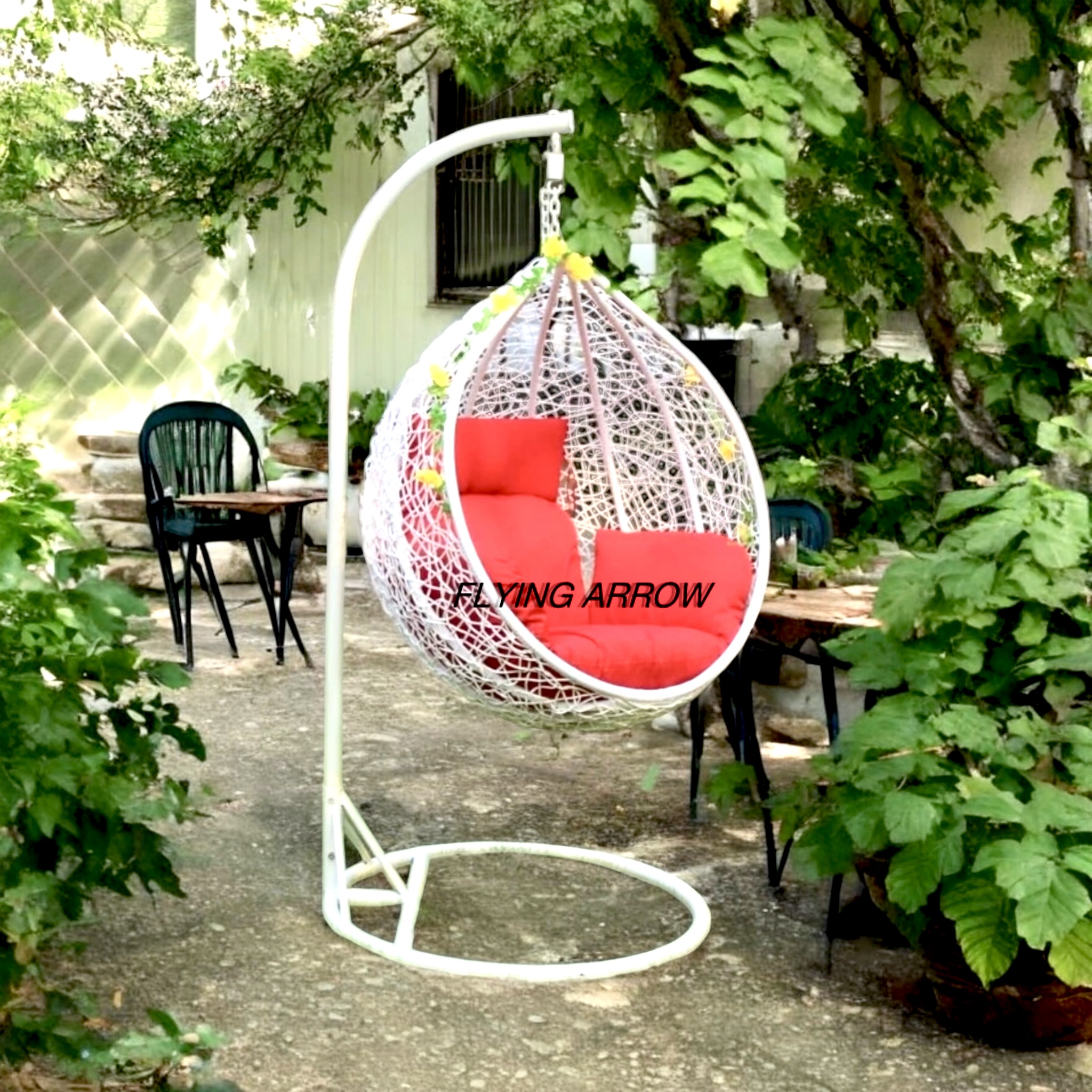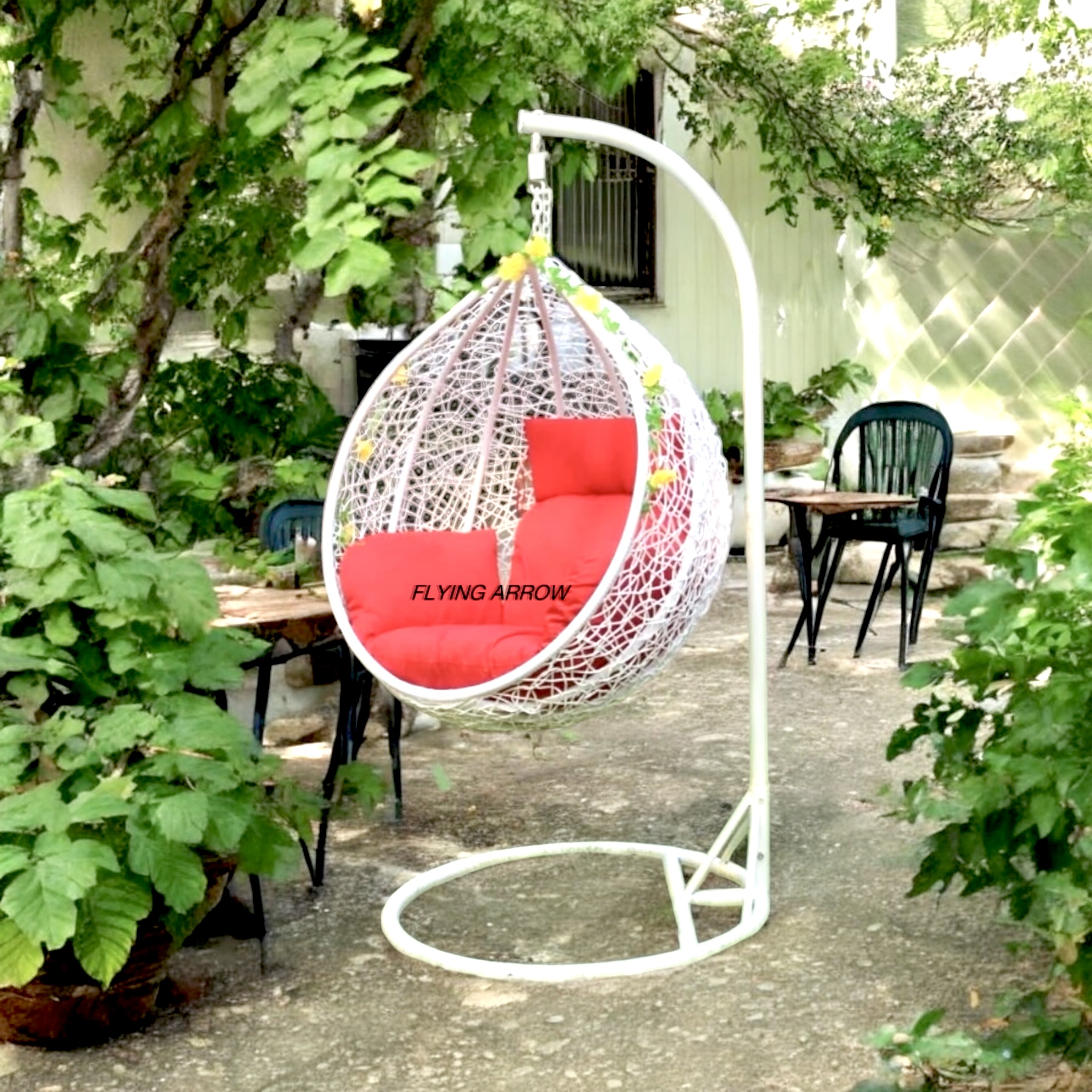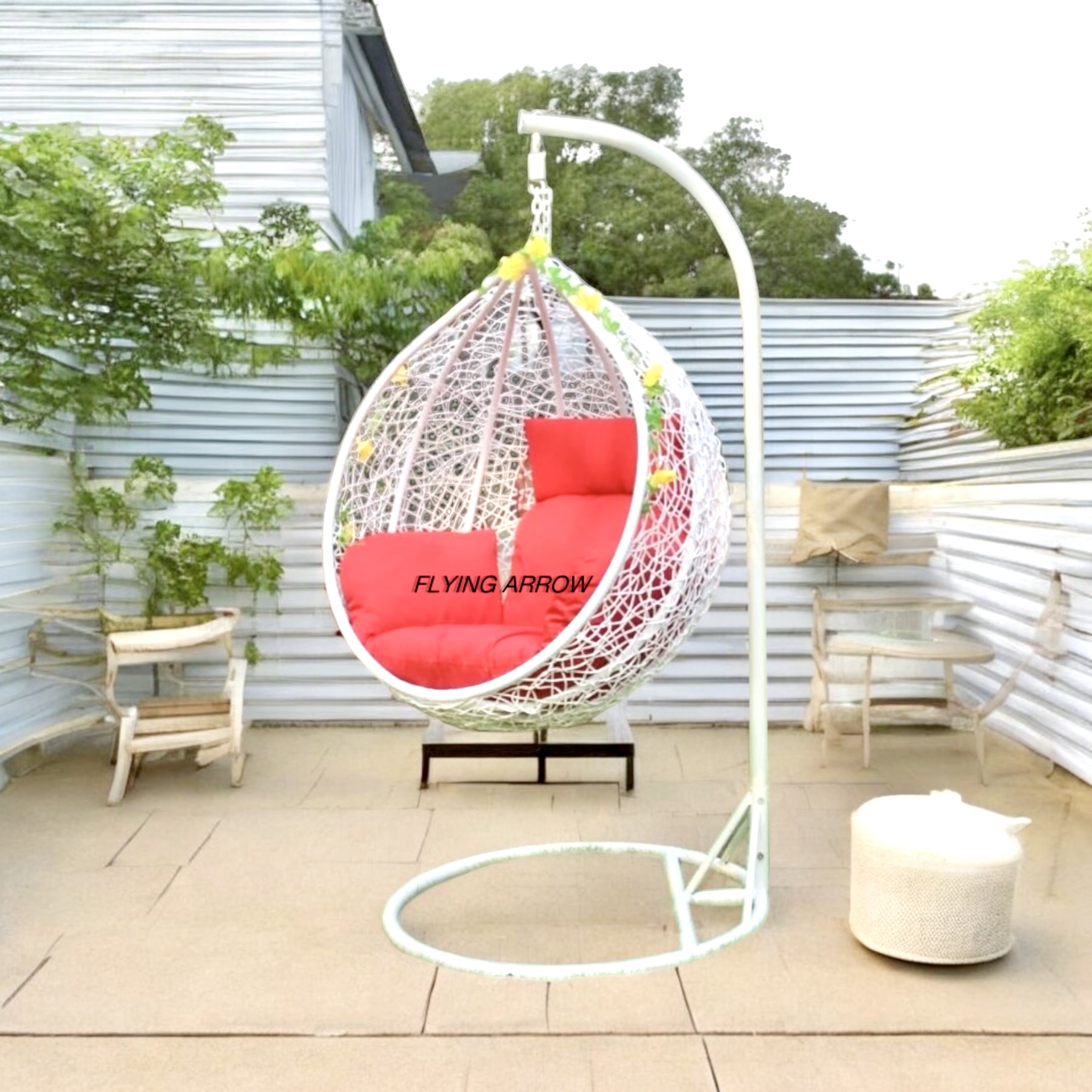 FLYING ARROW OUTDOOR SINGLE SEATER WHITE BEAUTIFUL SWING BASKET WITH RED COUSHION