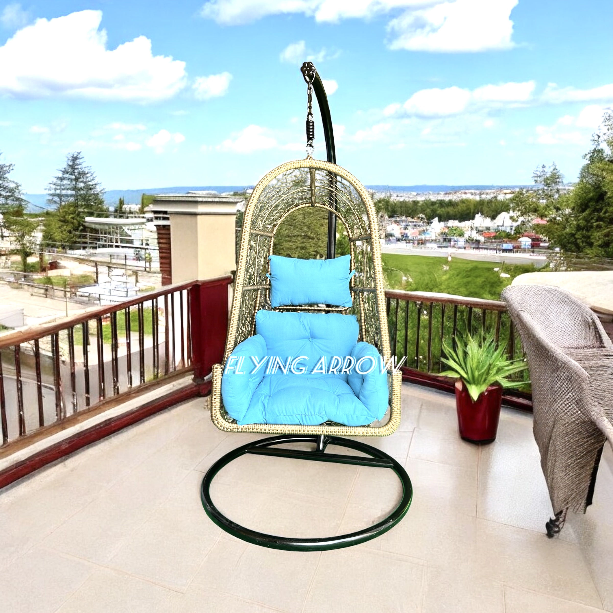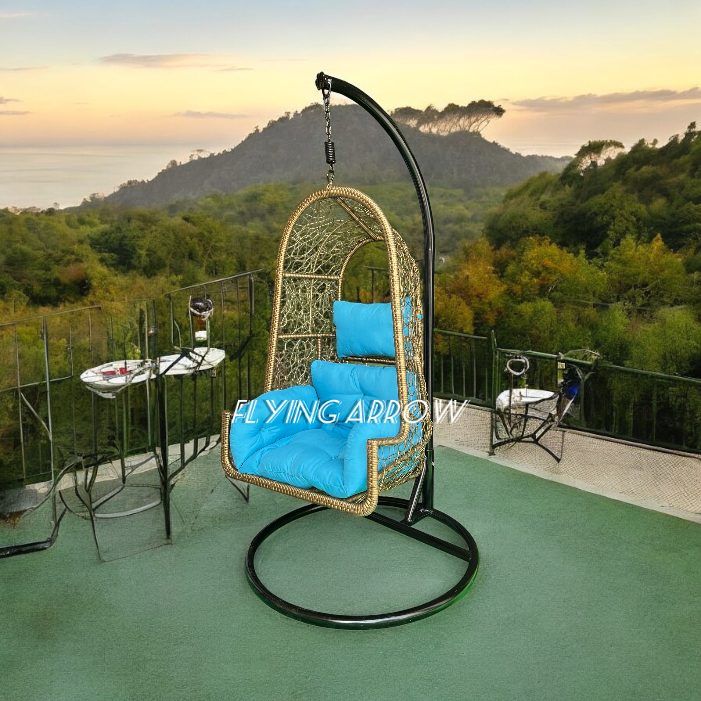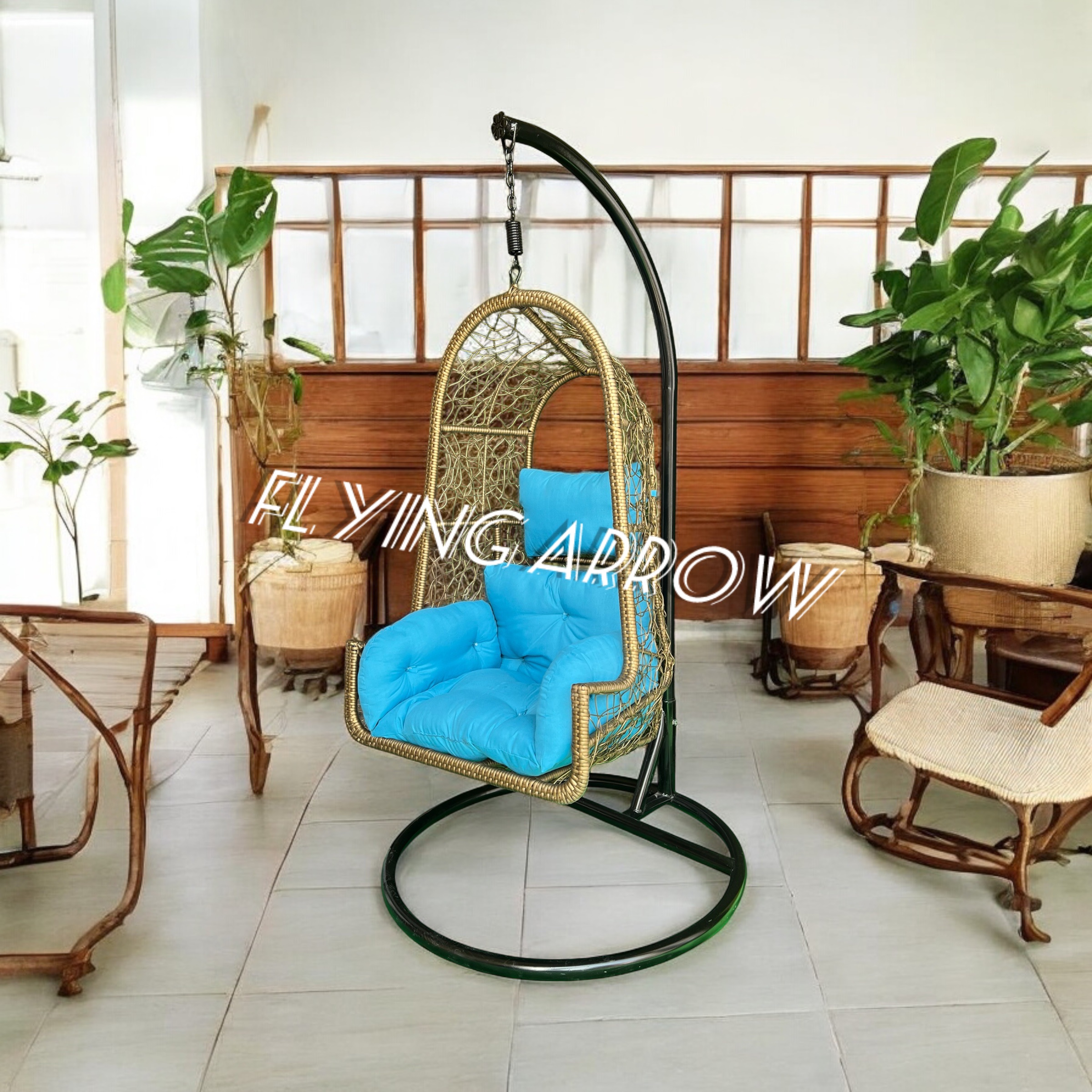 SINGLE SEATER HANGING  SWING GOLDEN BASKET WITH LIGHT BLUE CUSHIONS